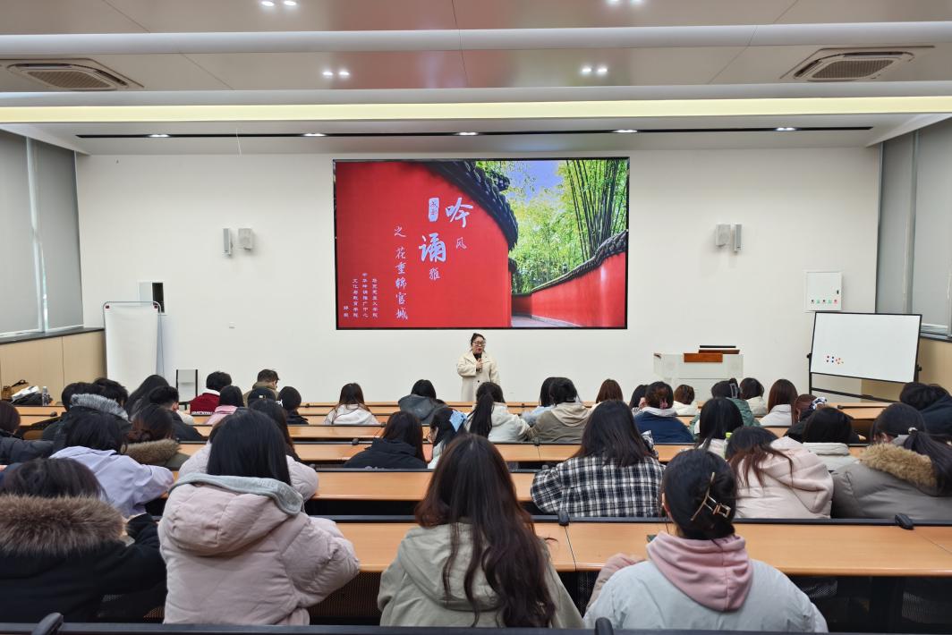 为深入贯彻落实新时代高校立德树人根本任务,推动中华优秀传统文化融入思想政治教育,提升师生人文素养与文化自信,12月30日,马克思主义学院在成都校区(东区)举办了“吟风诵雅之花重锦官城”主题讲座。本次讲座由四川省吟诵学会理事、绵阳市吟诵学会原副会长、文化与教育学院分党委书记邓毅主讲,共计百余名师生参加活动。讲座现场邓毅以“中华吟诵...