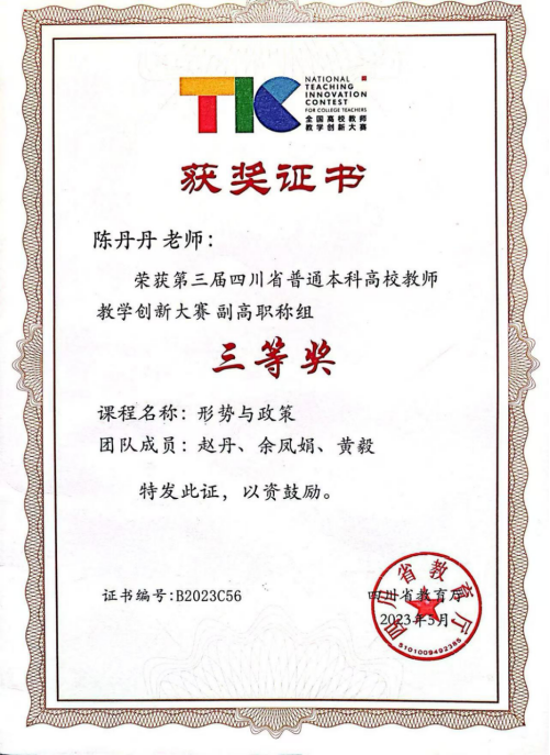 陈丹丹老师荣获第三届四川省普通本科高校教师教学创新大赛(副高职称组)三等奖